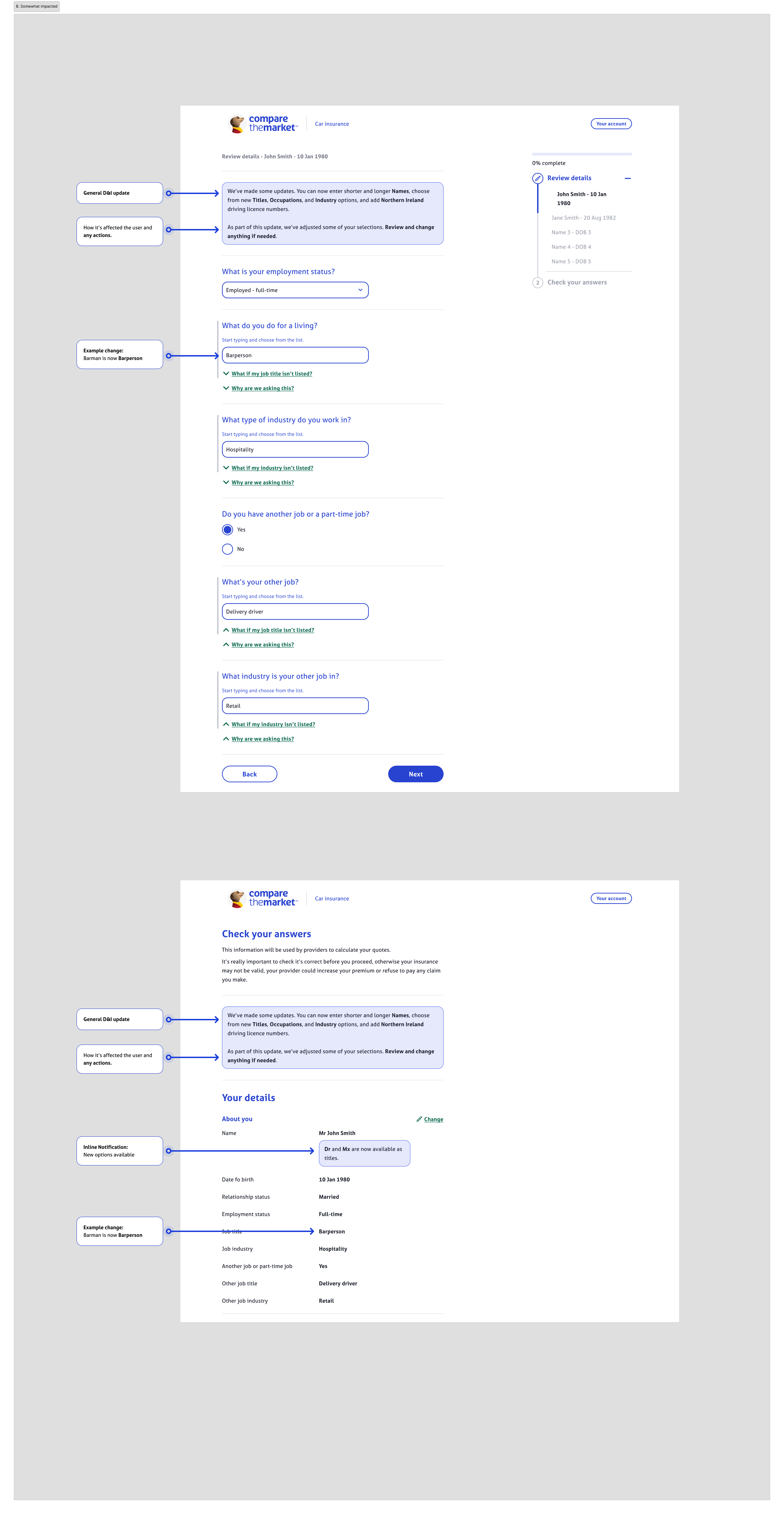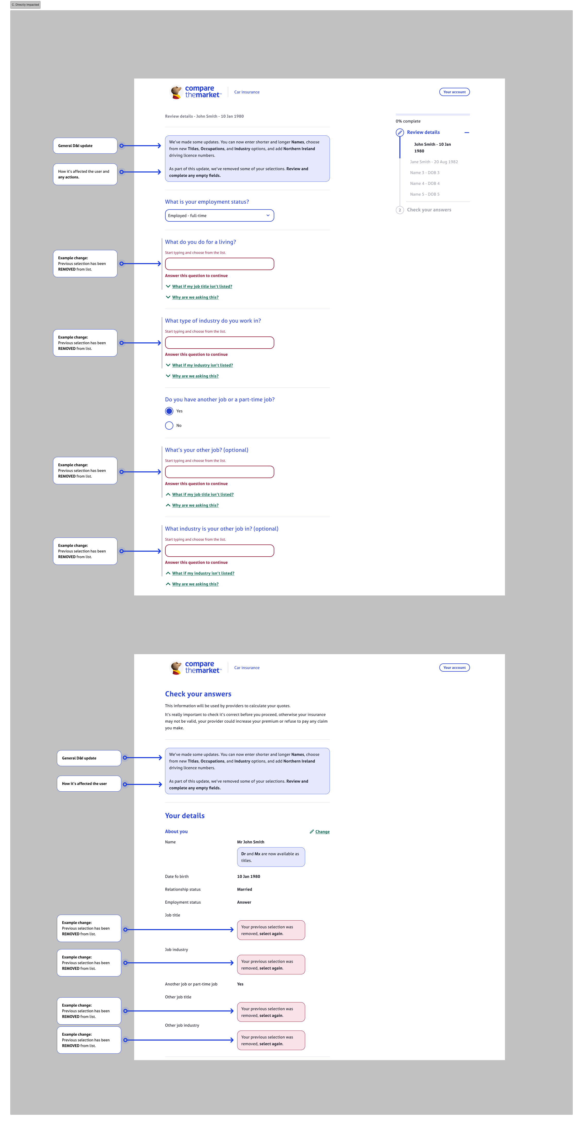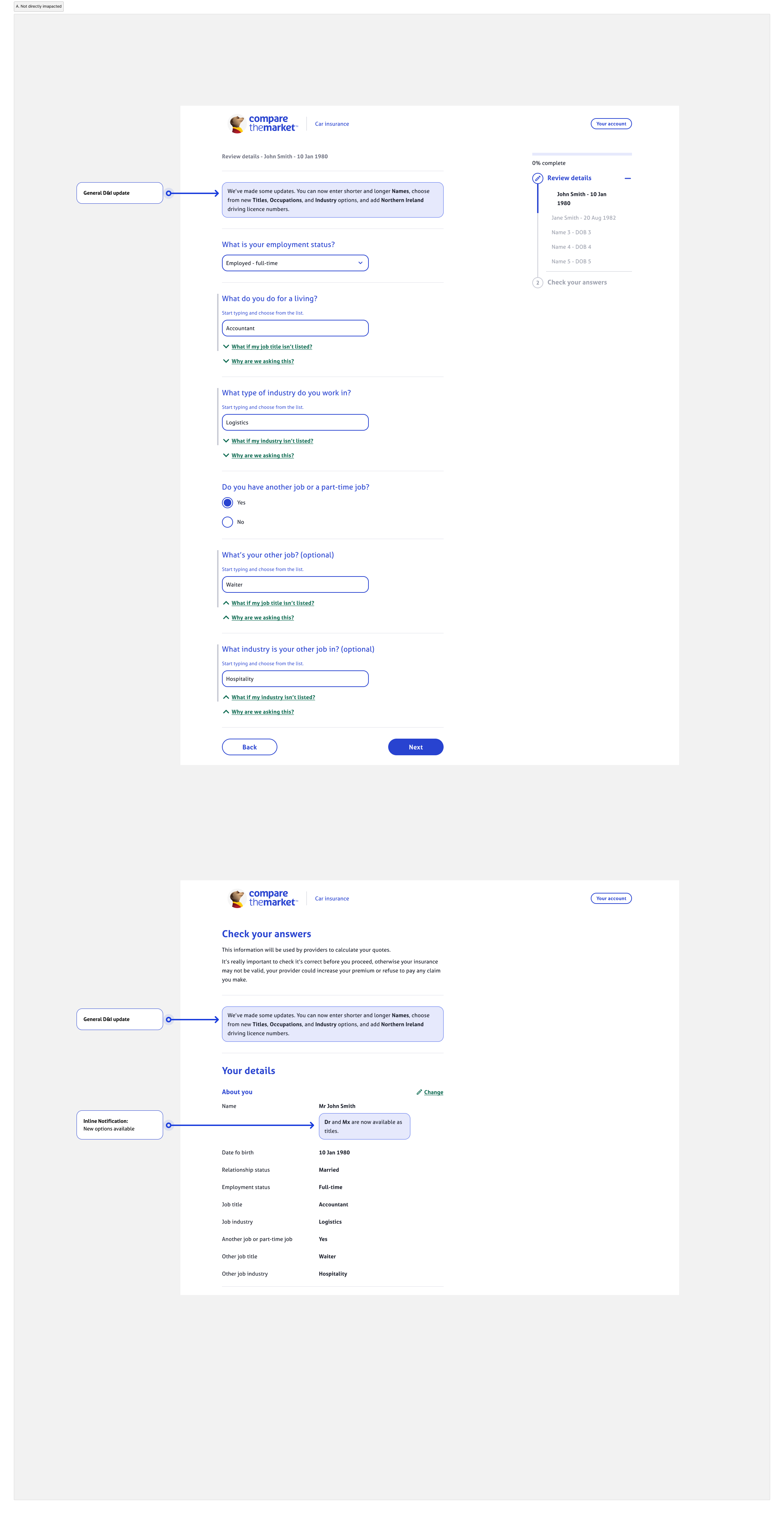 I delivered light touch in journey notifications that highlighted these changes, so users could achieve a smooth transition from the old to the new question set.